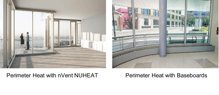 NUHEAT systems are ideal for heat loss replacement around curtain walls. This ensures more heat is retained in the room and keeps floor-to-ceiling windows free of condensation.