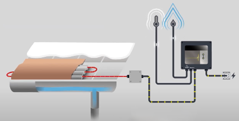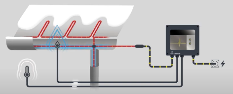 A typical roof and gutter de-icing system uses a visible zigzag of self-regulating heating cable to melt snow and ice along the roof edge. This method is effective but for many projects, the visible electrical cable can be seen as a drawback.
